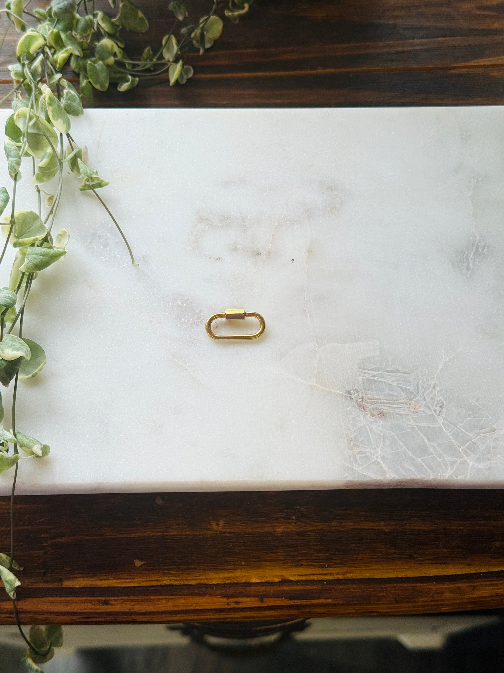 The Stainless Steel Classic Carabiner Charm Clasp features a polished finish made of 316L stainless steel with an easy-to-open, twisting center piece to open and close.