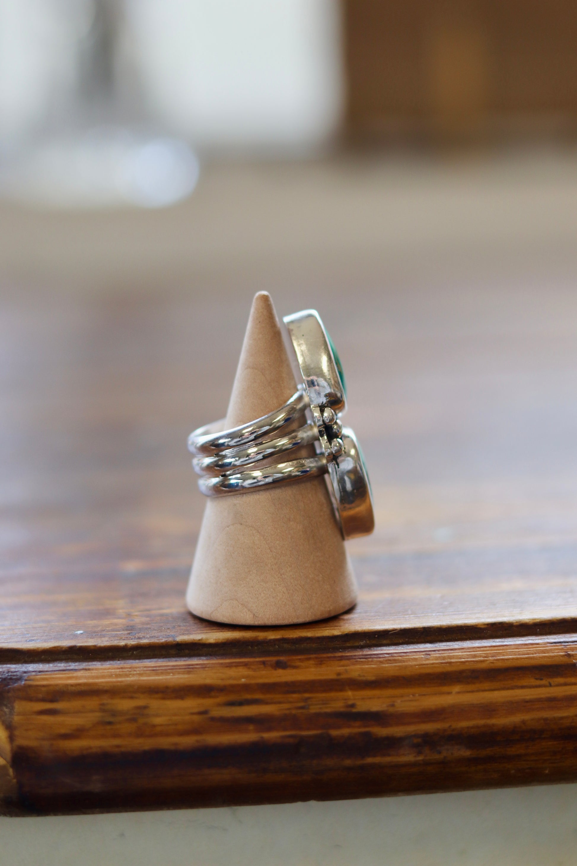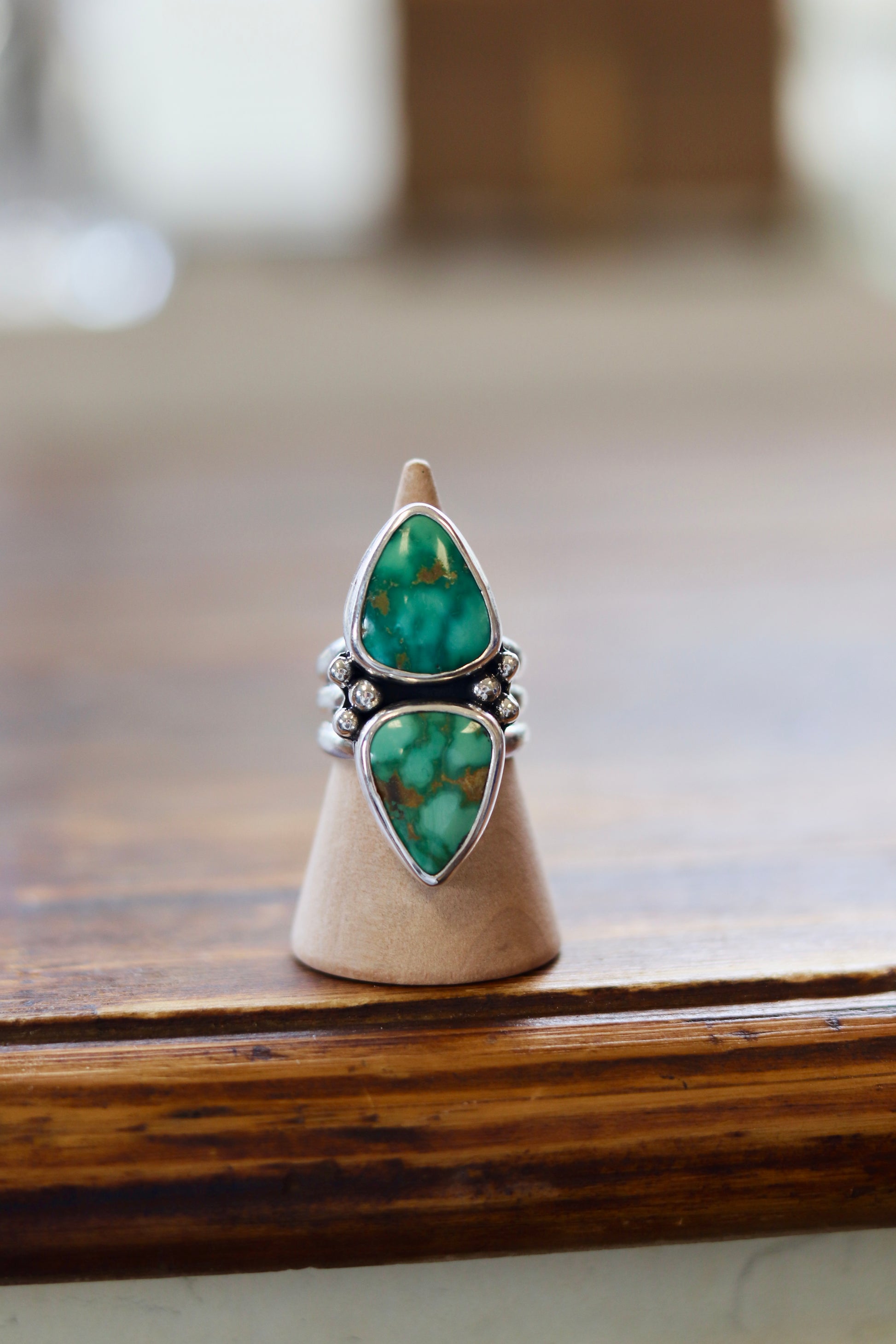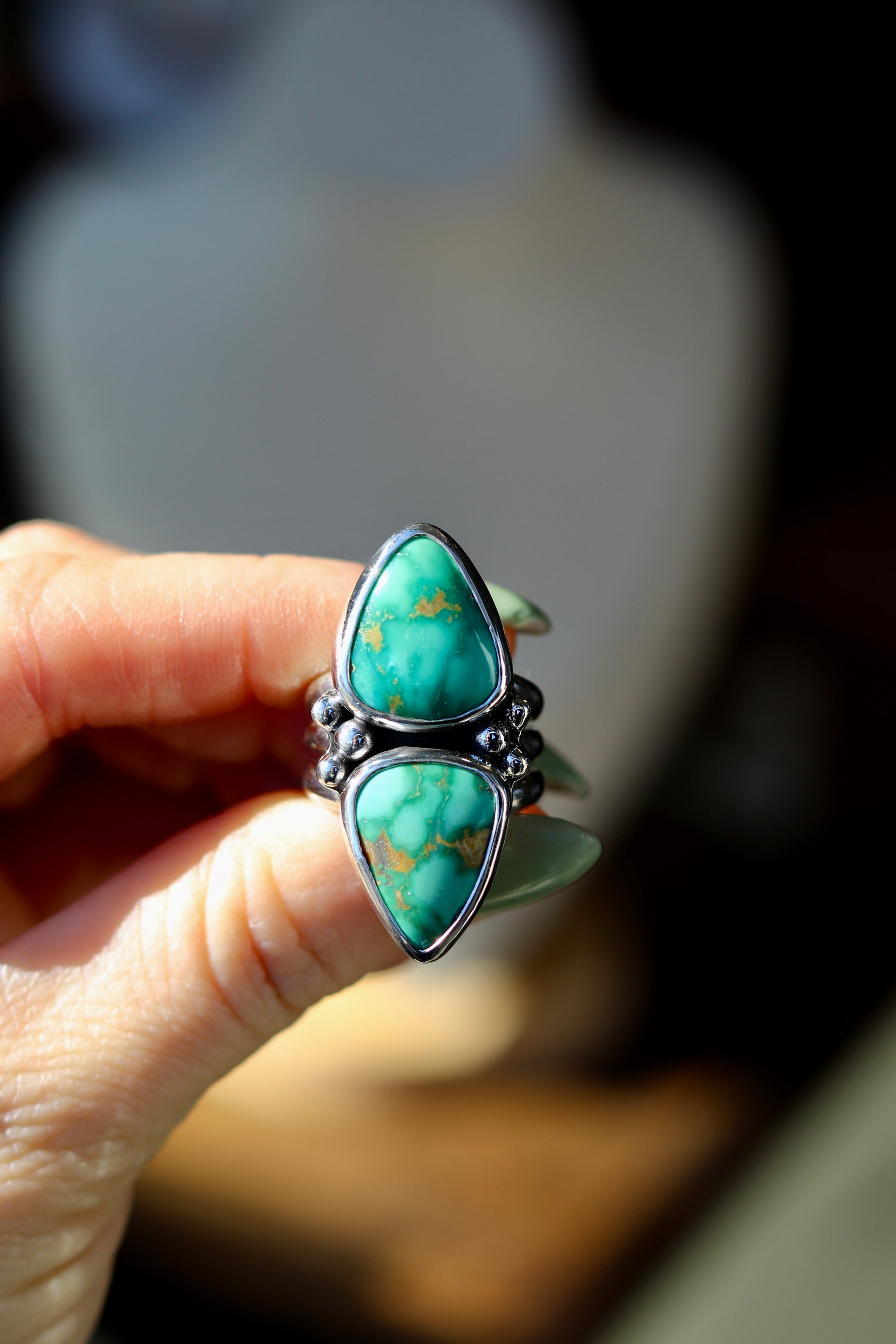 From the Eden Collection, this ring reflects growth, duality, and connection. Two Emerald Valley turquoise stones mined in Nevada near the Royston region rest side by side on a split three-band shank, like twin elements in harmony. Crafted in heavy 18 gauge silver, it is both strong and organic. Truly an heirloom piece.