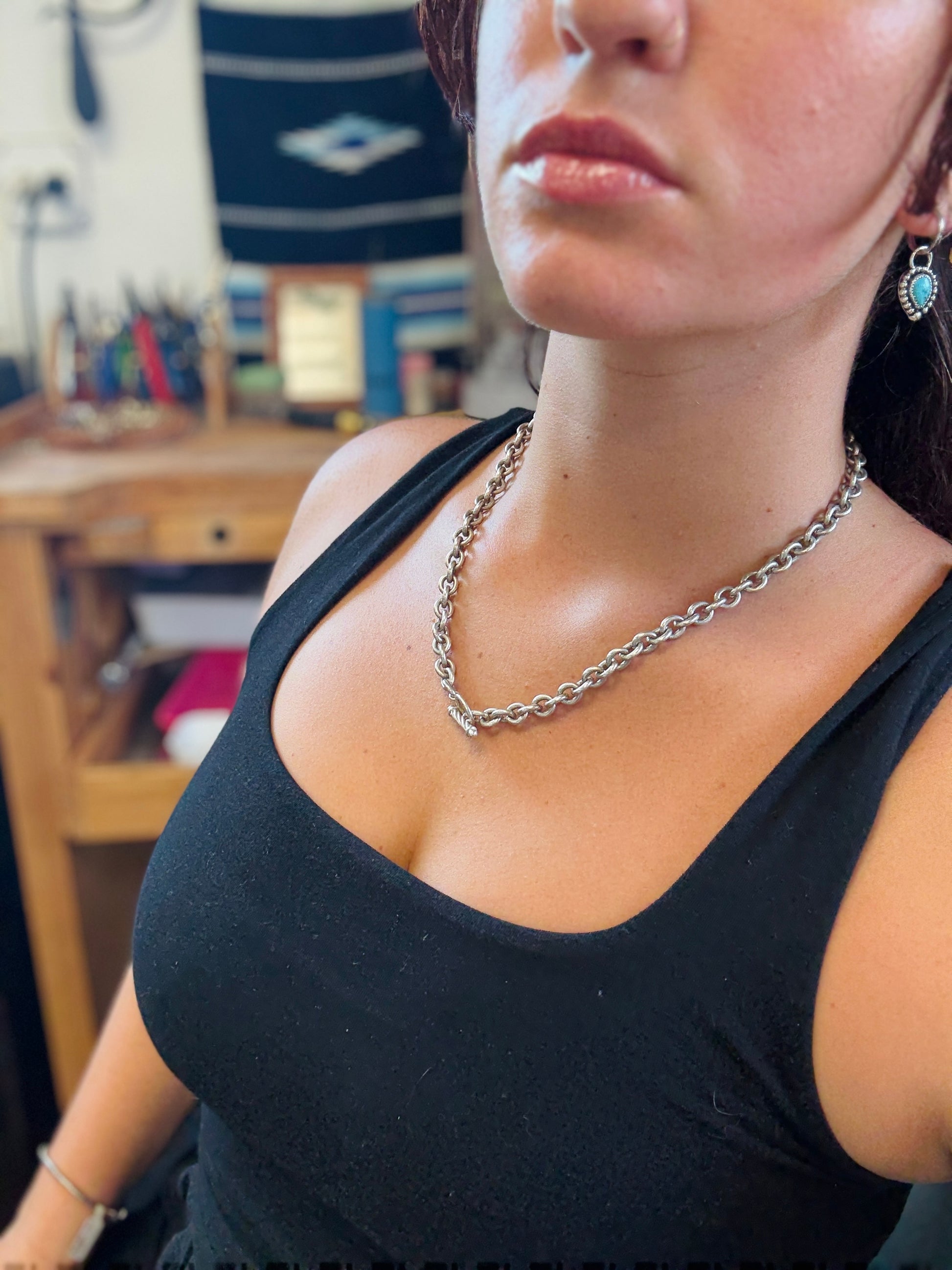 - Vintage Dapped Toggle Chain, toggle can be shown front or hidden for different looks. 18in