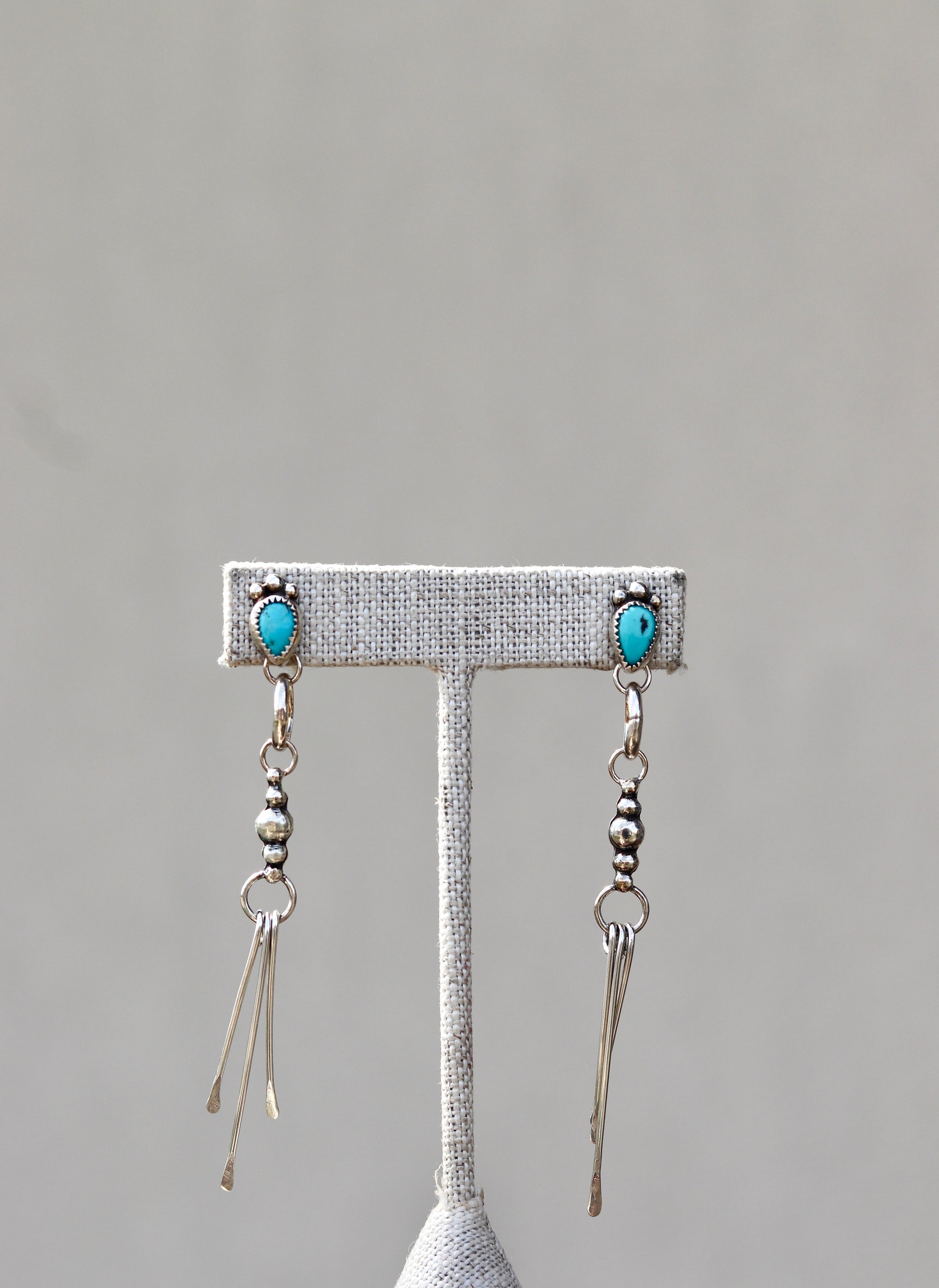 The Foxy Lady Earrings are a bold statement piece featuring genuine Kingman turquoise studs that flow into a graduated sterling silver bead design with elegant silver fringe. Measuring 3.5 inches long, they’re lightweight for comfortable wear while still delivering plenty of movement and eye-catching shine.