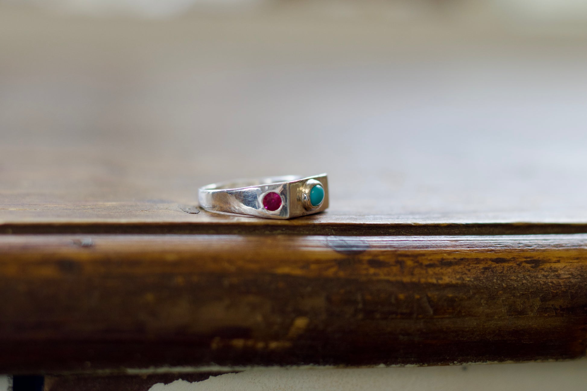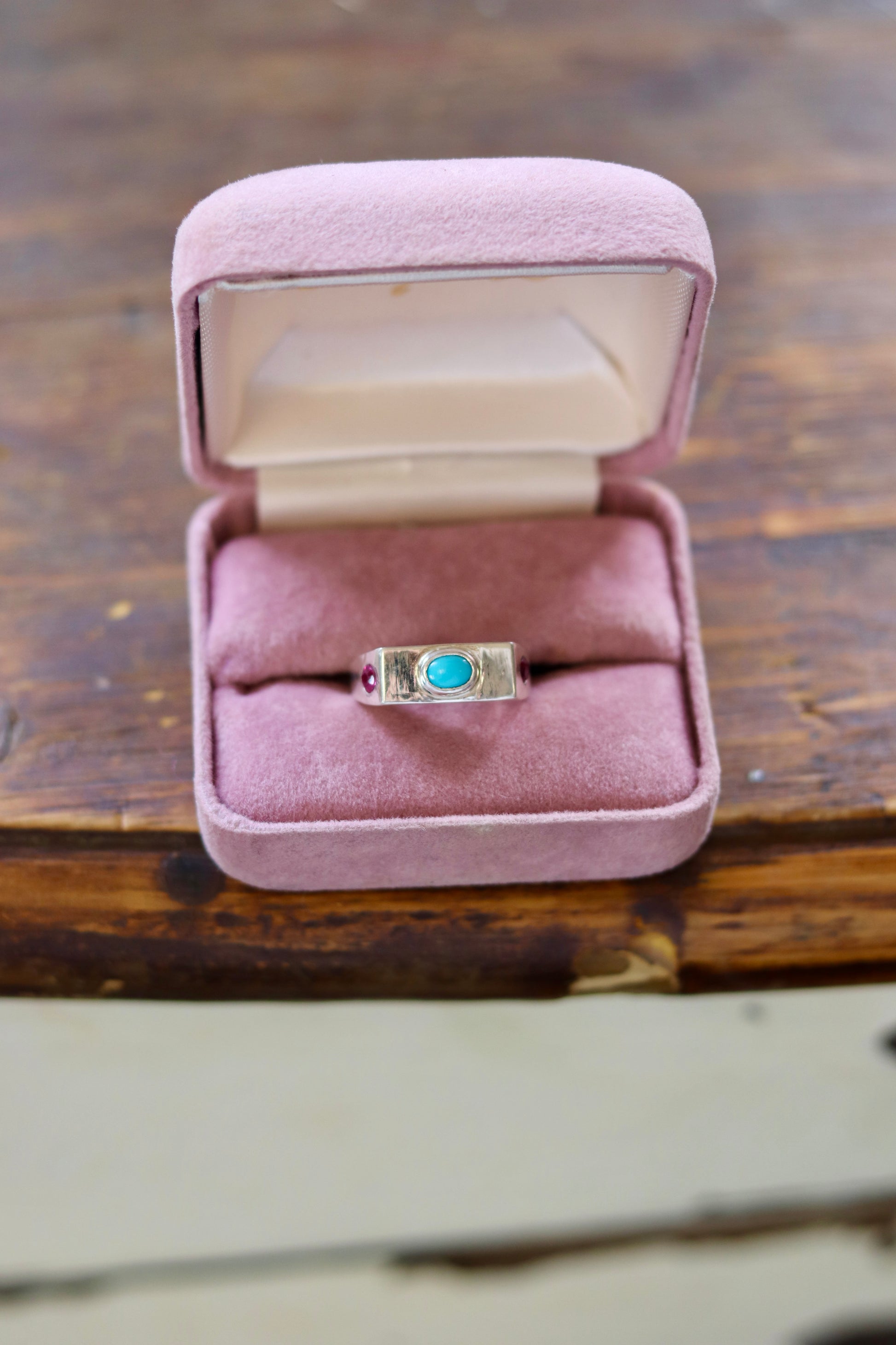 Carved by hand and cast in sterling silver, this rectangular signet ring carries the weight of something meant to last. An Arizona turquoise anchors the front, while two vintage rubies are flush set into the sides. A future antique with a story already built in.