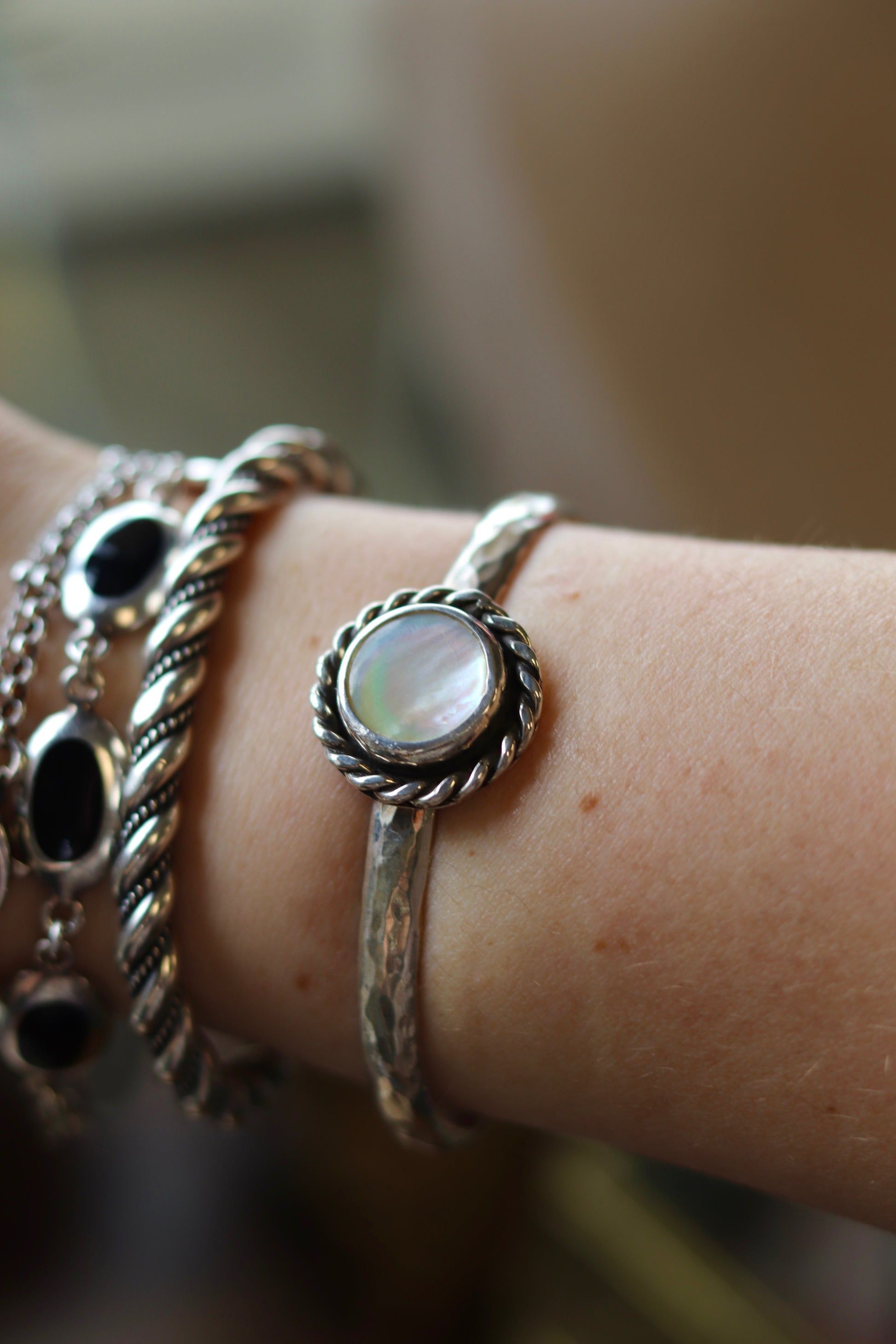 Round mother of pearl shell cuff delicately set in hand twisted wire on a 6in hammered cuff