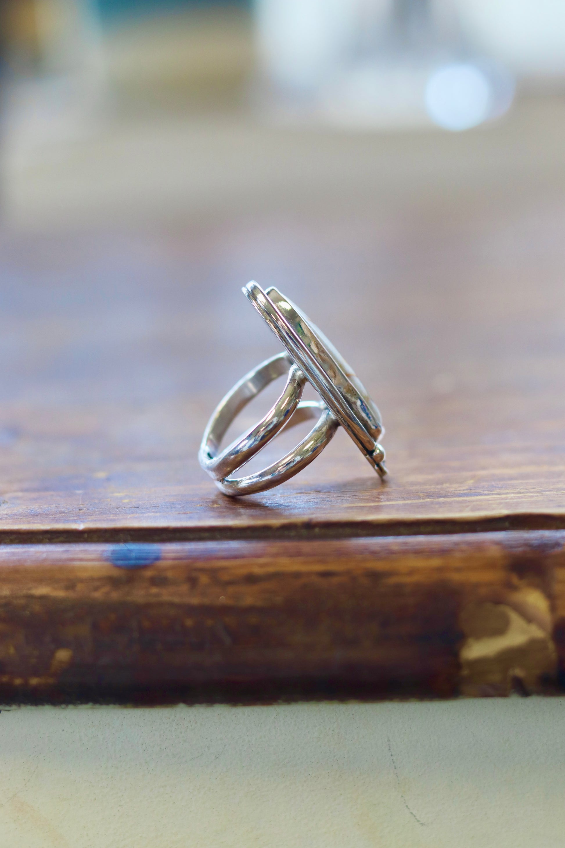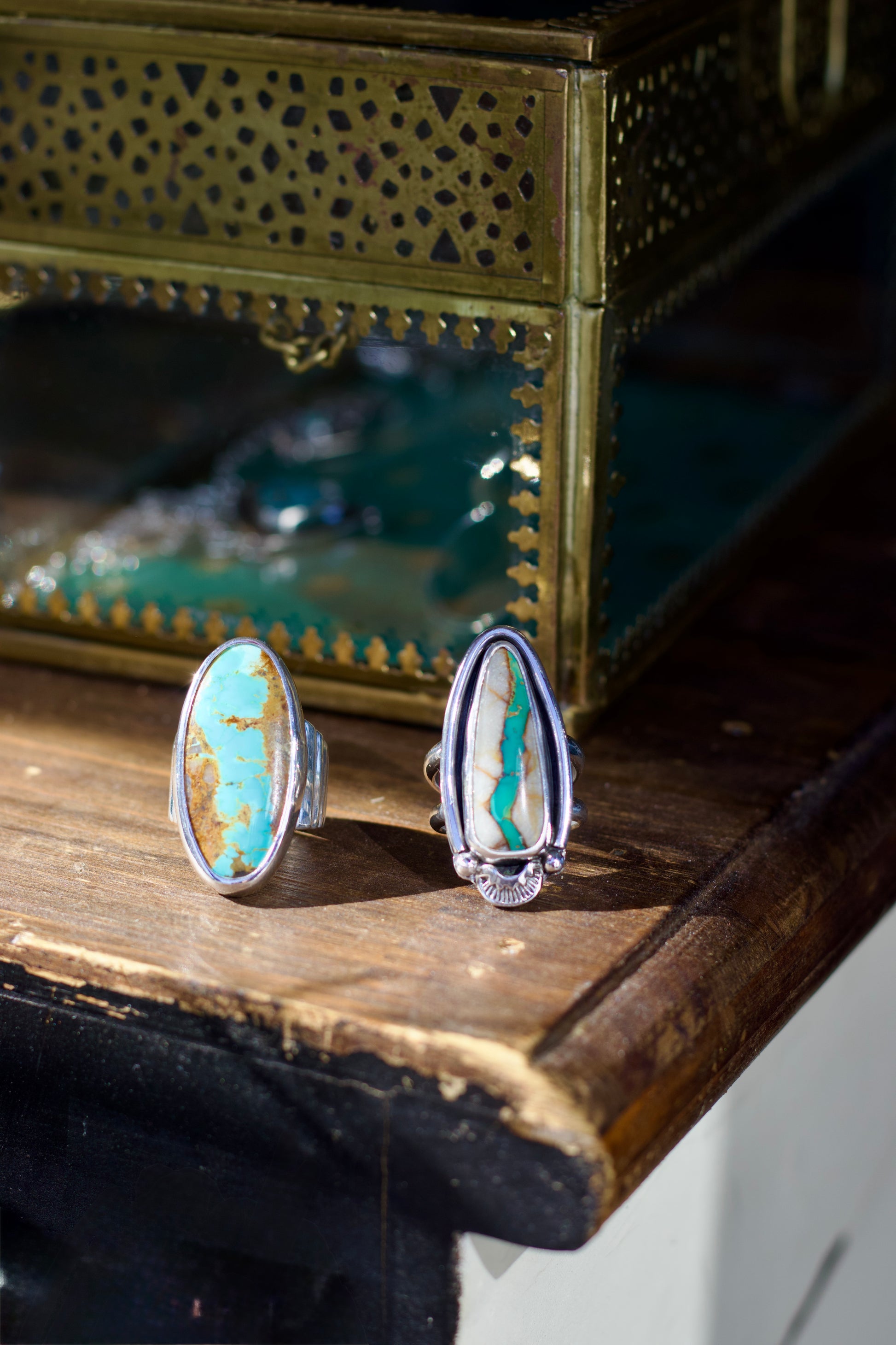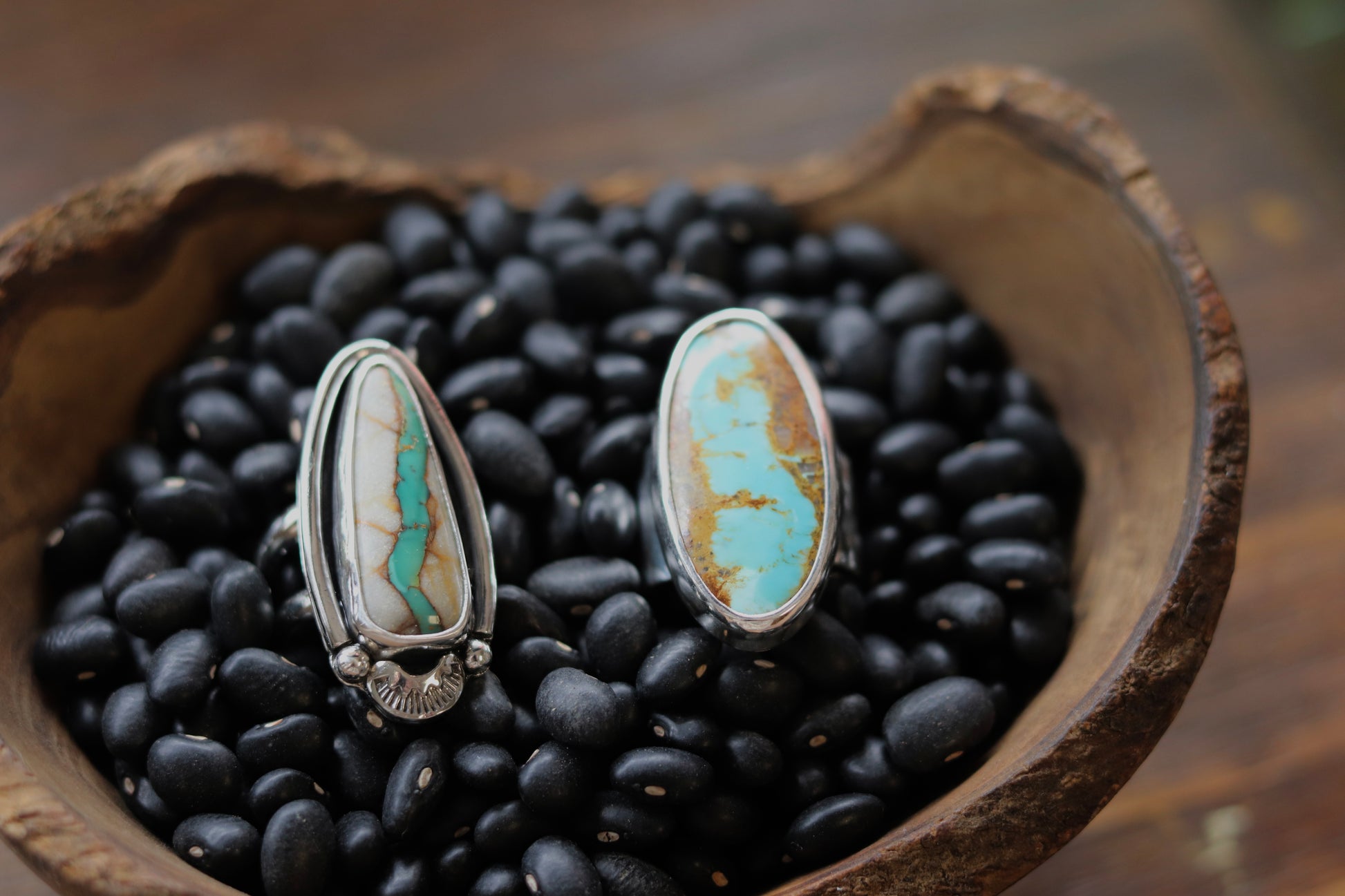 Inspired by desert landscapes and winding water paths, this ring features Royston turquoise mined in Northeast Nevada. The turquoise naturally runs through the host rock like a river, creating a beautiful patterns. Set in a flowing silver band, it feels both grounded and in motion.