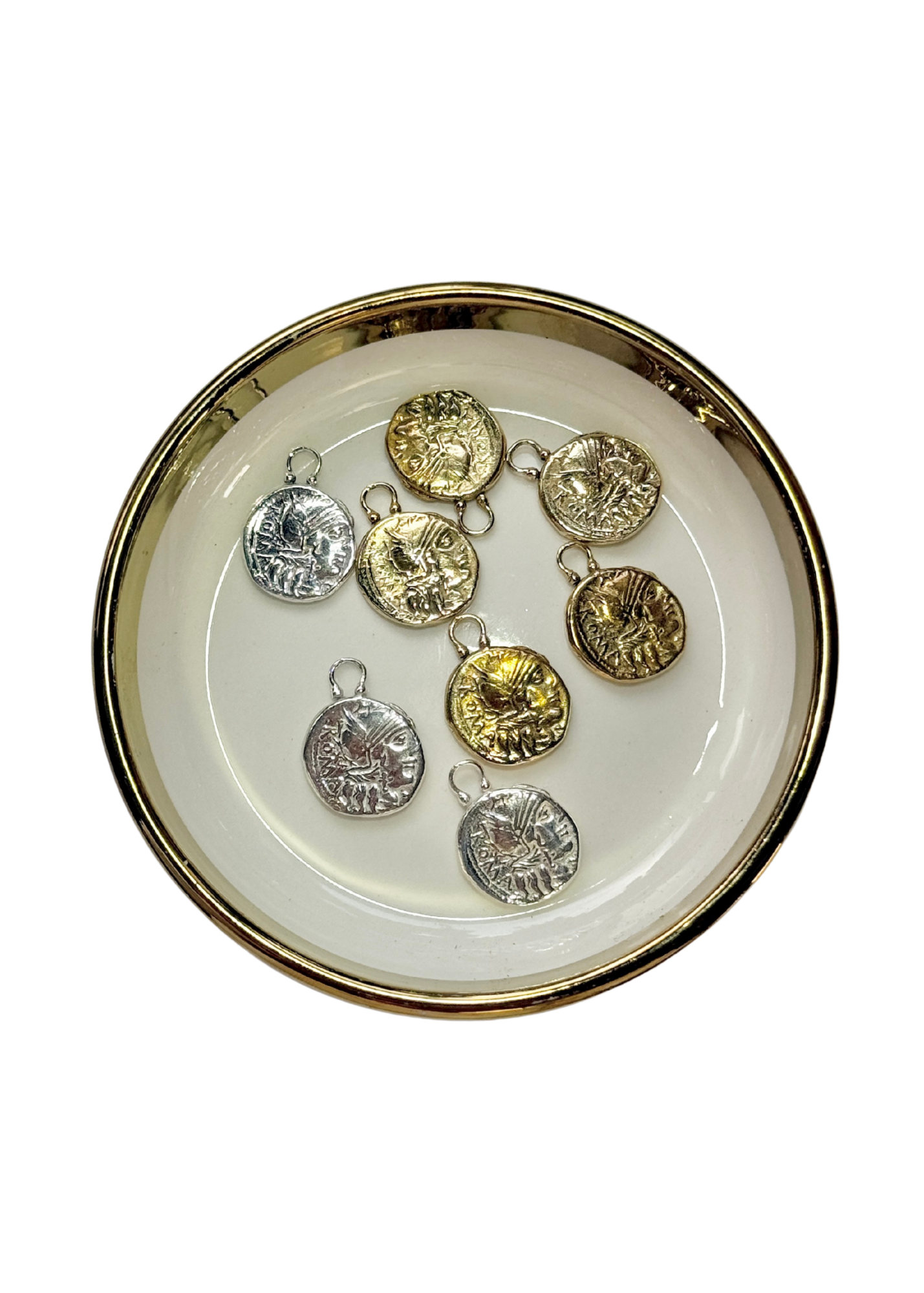 This charm is cast directly from an original Roman Republican coin I sourced in italy. The original coin dates to the Roman Republic (circa 3rd–2nd century BCE) and features the helmeted head of Roma, the symbolic protector and personification of the city of Rome.