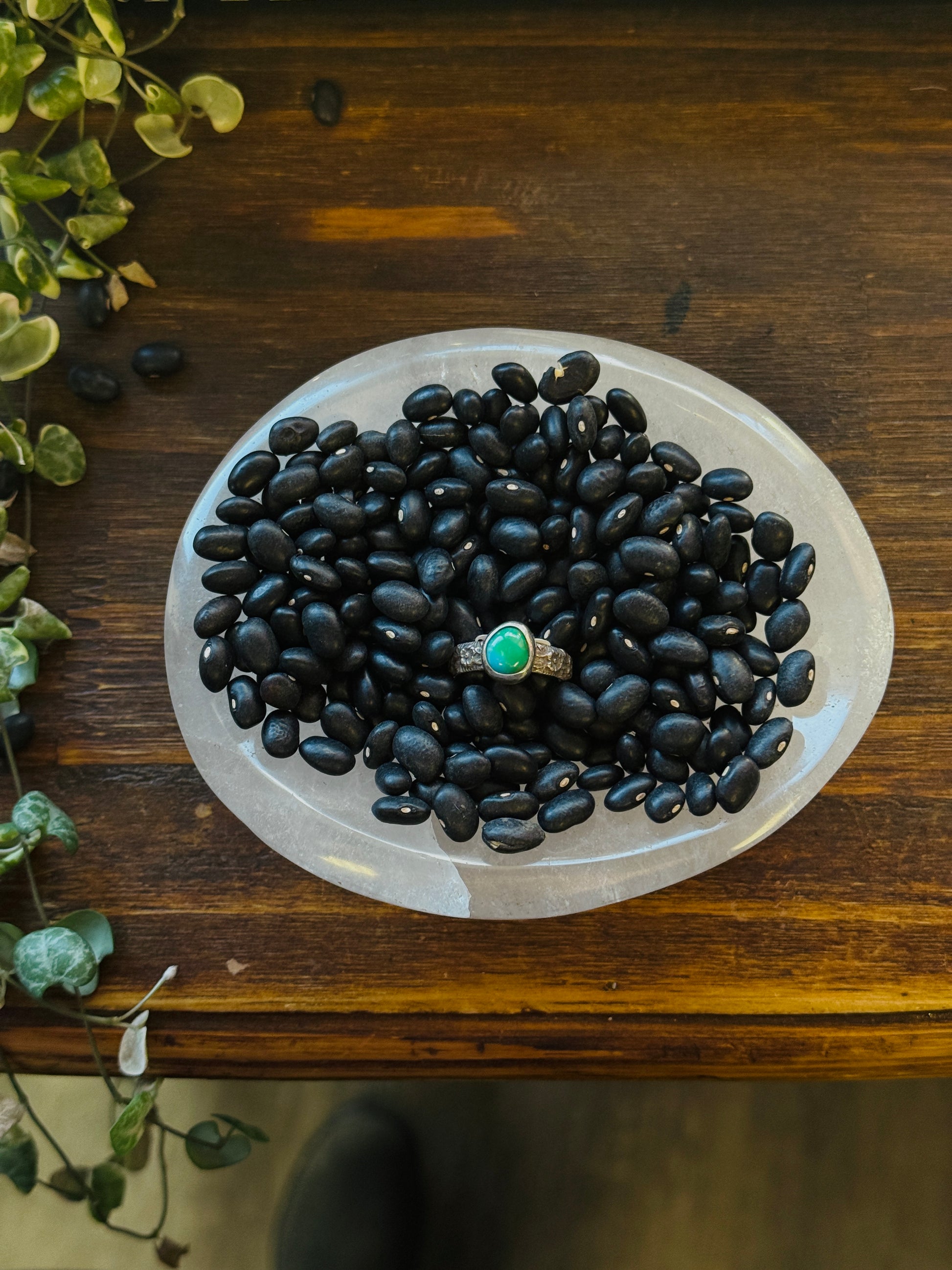 Sonoran Gold Turquoise stone set on our signature Wild Rose band. Vibrant green-blue tones with natural golden matrix make this ring a true standout. Crafted by hand in sterling silver.